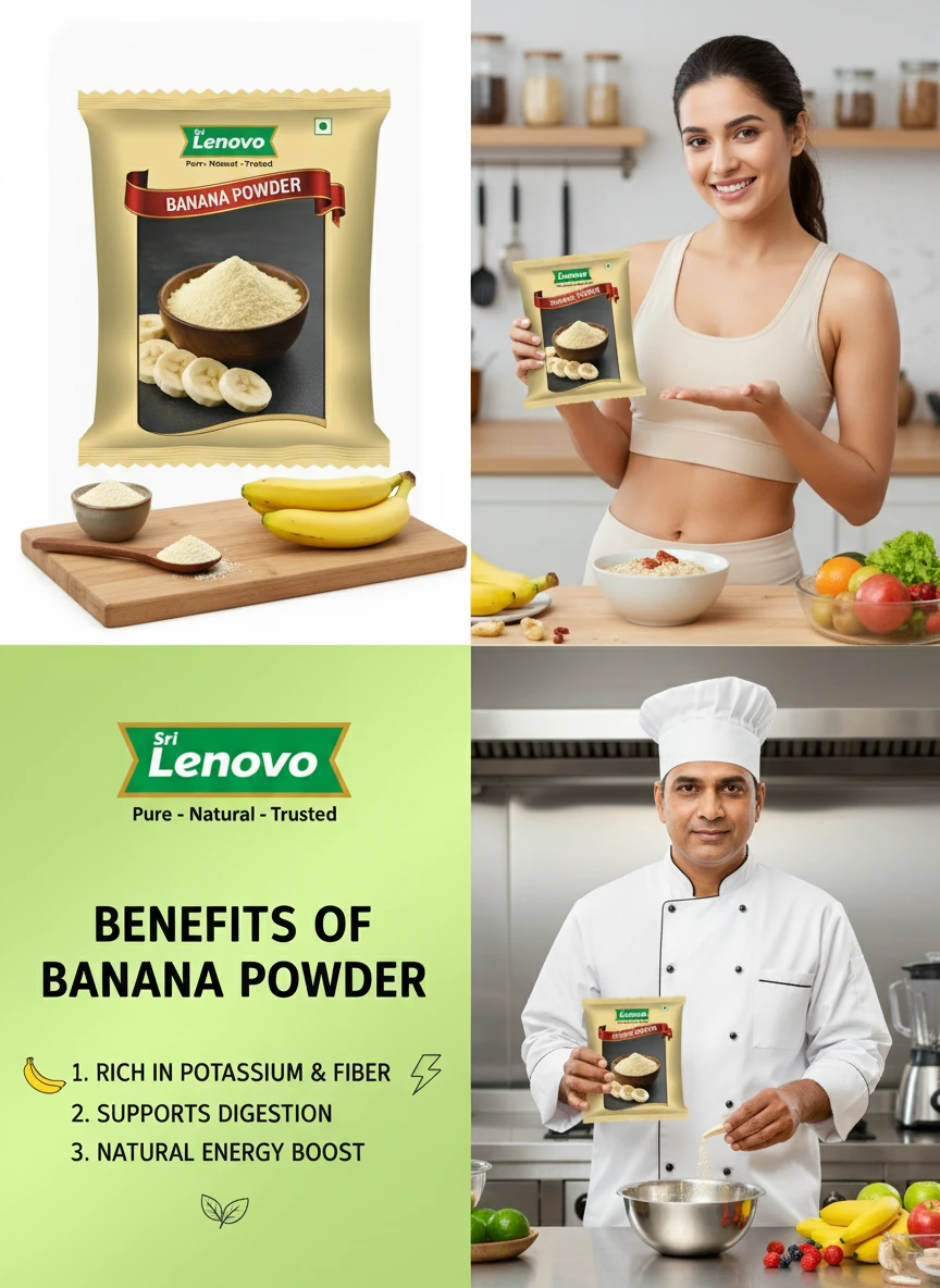 100% Pure Banana Powder Source Nutritional Value & Wellness Support: Sri Lenovo Banana Powder is naturally rich in essential nutrients and traditionally valued for supporting overall wellness. It contains naturally occurring compounds that support digestion, nourishment, and daily energy. Free from harmful chemicals, artificial colours, and preservatives, it is safe for regular consumption.