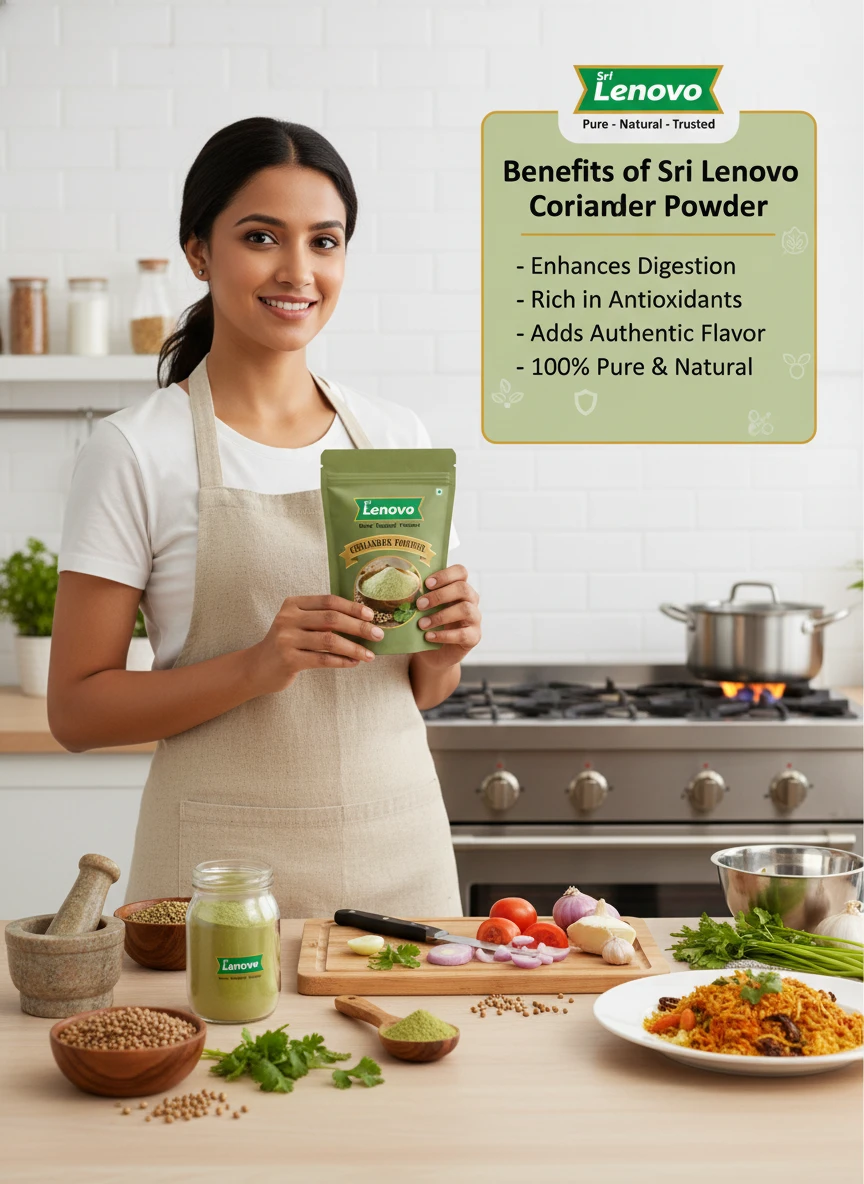 Sri Lenovo Coriander Powder stands out for its natural appearance, clean aroma, and fine texture. Carefully processed to maintain original characteristics, it delivers dependable quality and authentic taste suitable for modern kitchens and traditional practices. How to Use: Sri Lenovo Coriander Powder can be used in daily cooking, beverages, health recipes, and traditional preparations. It mixes easily and enhances flavour, nutrition, or functionality depending on use. Why Choose Sri Lenovo: At Sri Lenovo, we focus on purity, hygiene, and trust. Our products are made with care using quality ingredients and clean processing standards, ensuring safety, consistency, and satisfaction in every pack.