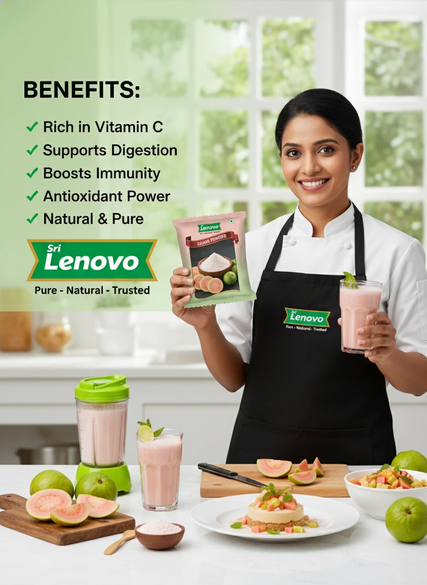 Sri Lenovo Guava Powder is prepared using carefully selected raw materials that are cleaned, processed, and finely powdered to preserve natural colour, aroma, and taste. This product is hygienically manufactured and packed to retain freshness and quality for everyday use. It blends easily into cooking and daily routines, offering consistency and purity in every serving.