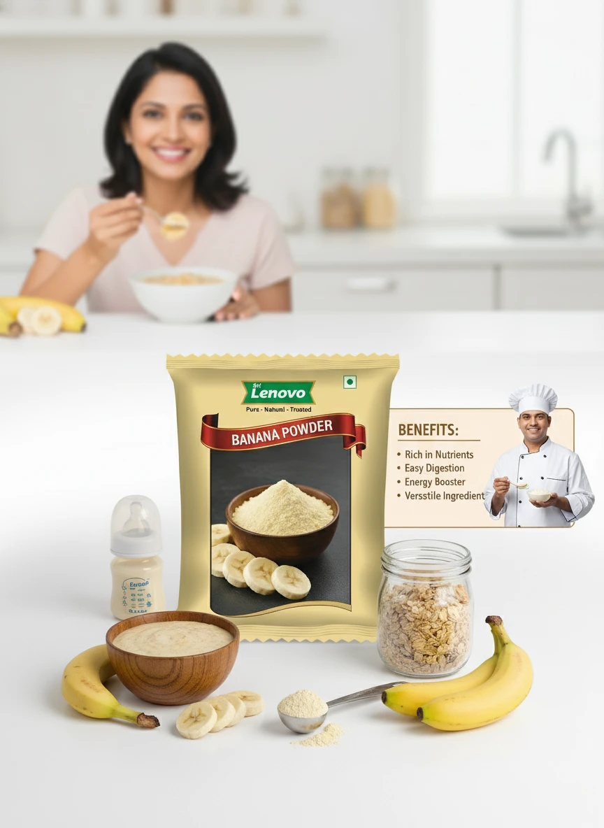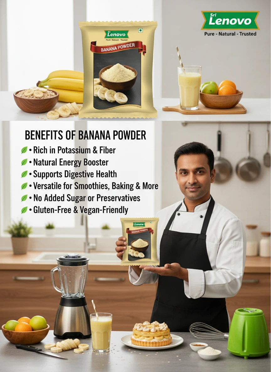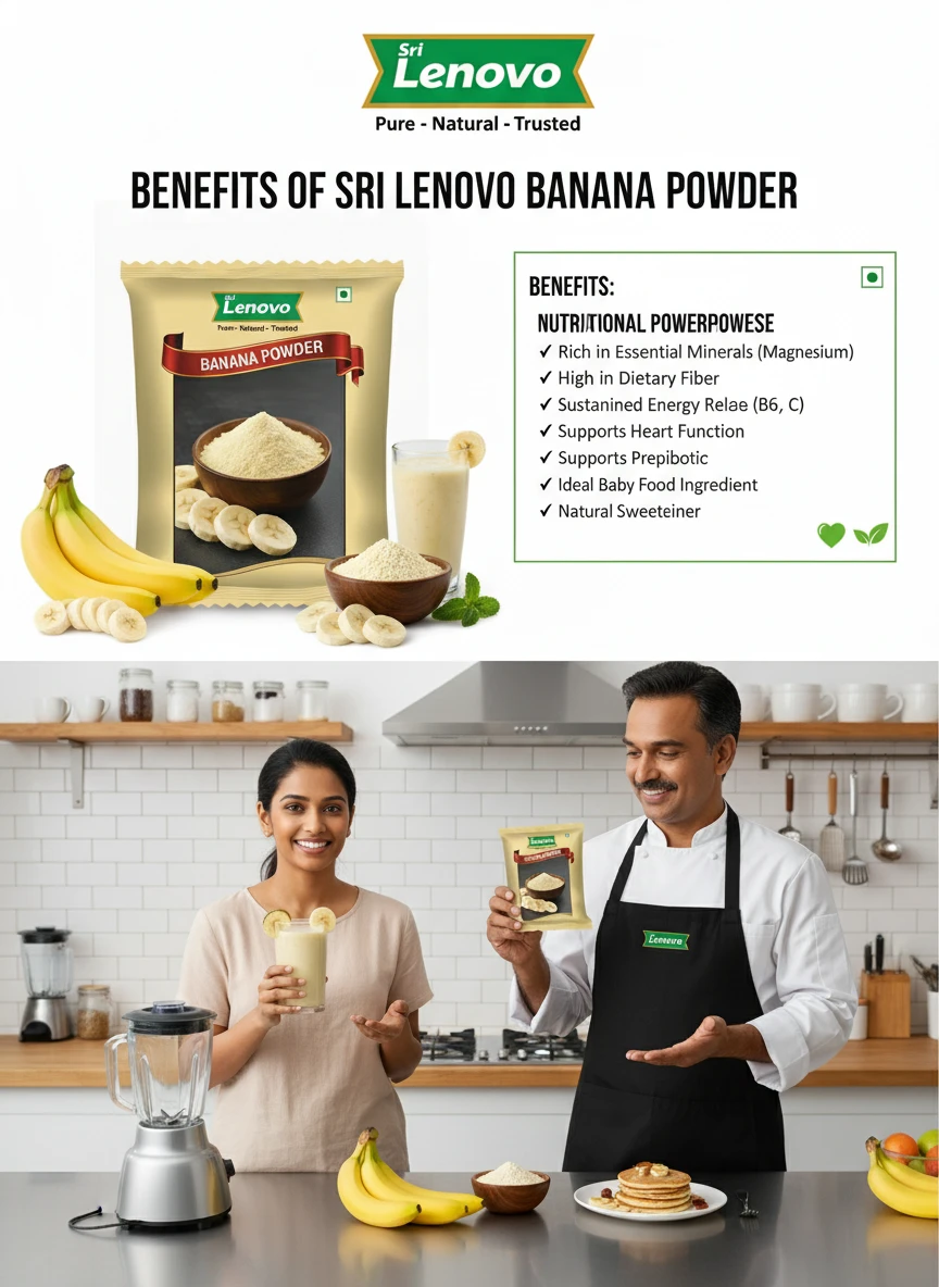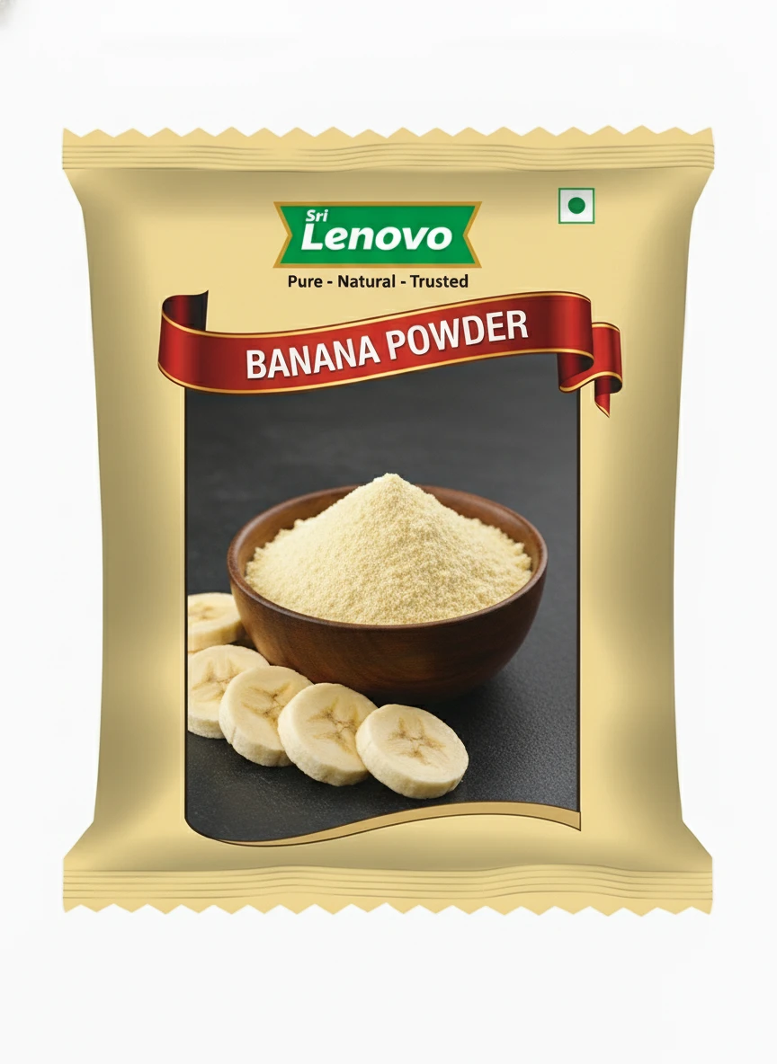 Sri Lenovo Banana Powder is prepared using carefully selected raw materials that are cleaned, processed, and finely powdered to preserve natural colour, aroma, and taste. This product is hygienically manufactured and packed to retain freshness and quality for everyday use. It blends easily into cooking and daily routines, offering consistency and purity in every serving.