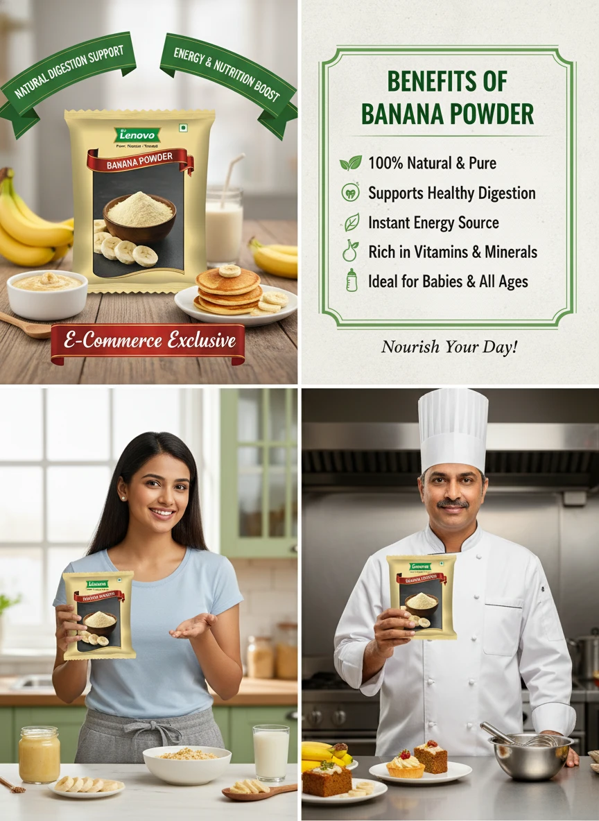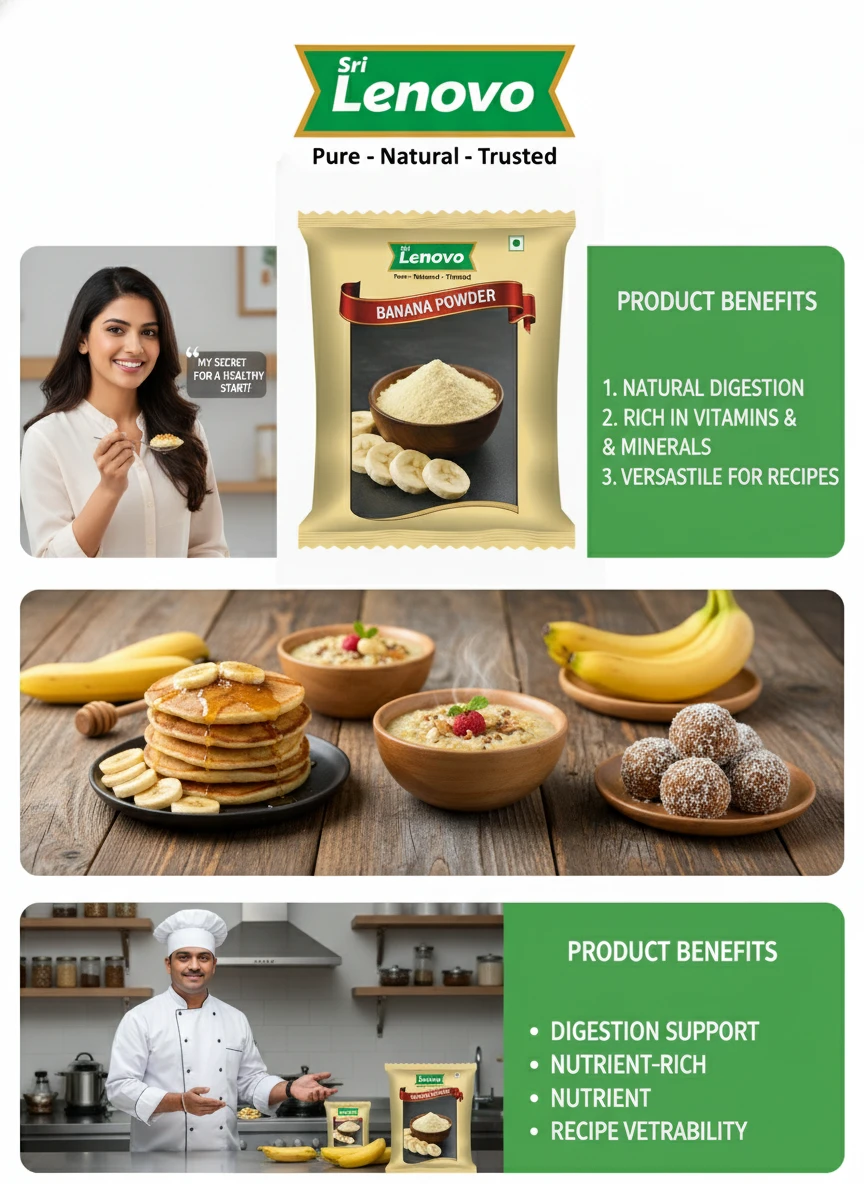 100% Pure Banana Powder Source Nutritional Value & Wellness Support: Sri Lenovo Banana Powder is naturally rich in essential nutrients and traditionally valued for supporting overall wellness. It contains naturally occurring compounds that support digestion, nourishment, and daily energy. Free from harmful chemicals, artificial colours, and preservatives, it is safe for regular consumption.