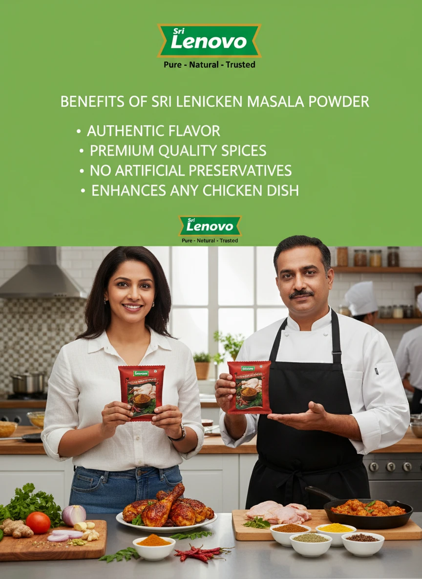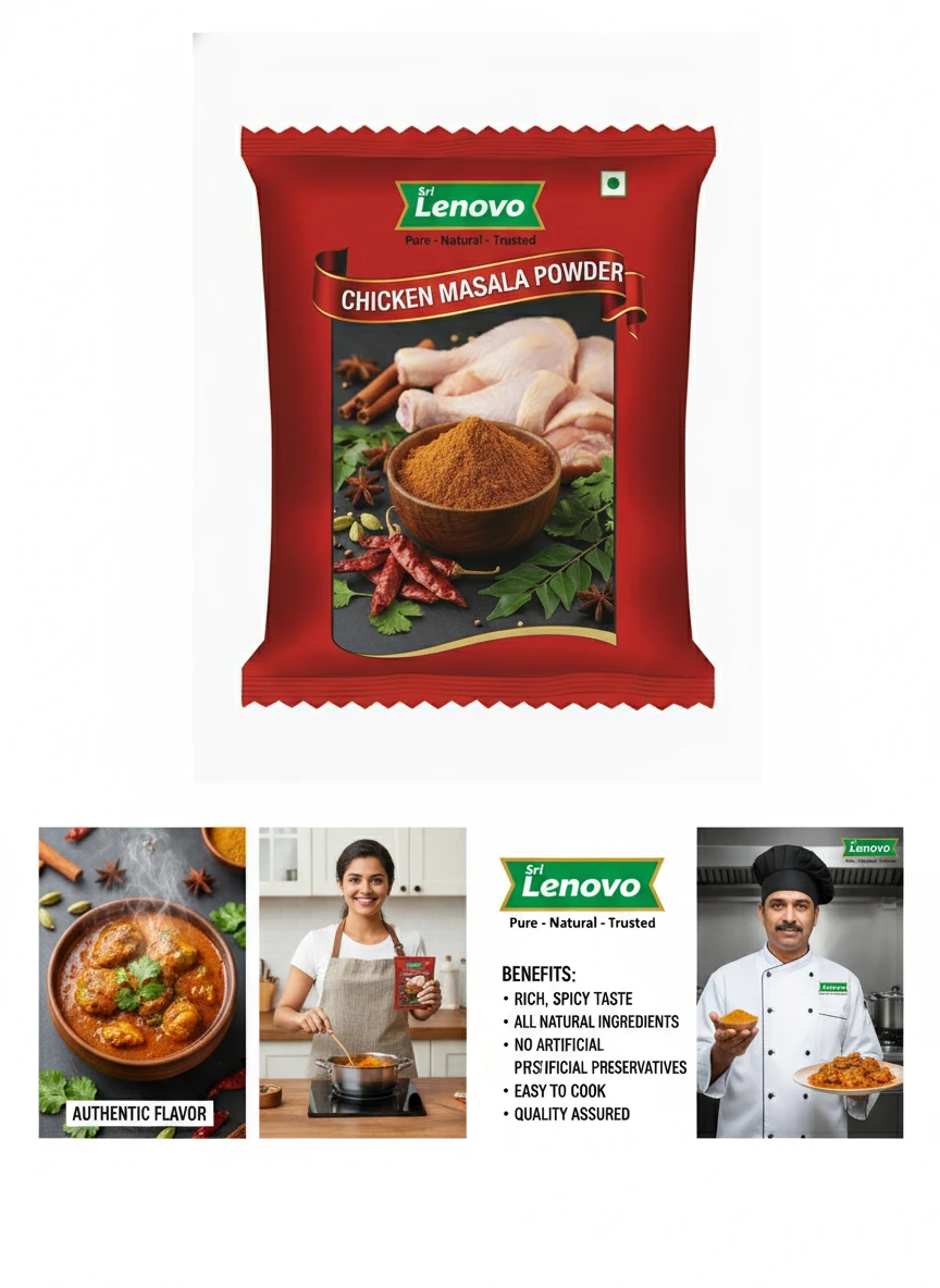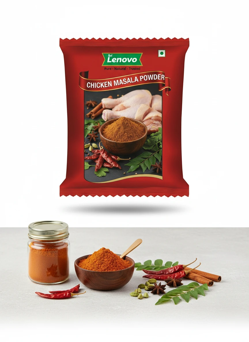 Sri Lenovo Chicken Masala Powder stands out for its natural appearance, clean aroma, and fine texture. Carefully processed to maintain original characteristics, it delivers dependable quality and authentic taste suitable for modern kitchens and traditional practices. How to Use: Sri Lenovo Chicken Masala Powder can be used in daily cooking, beverages, health recipes, and traditional preparations. It mixes easily and enhances flavour, nutrition, or functionality depending on use. Why Choose Sri Lenovo: At Sri Lenovo, we focus on purity, hygiene, and trust. Our products are made with care using quality ingredients and clean processing standards, ensuring safety, consistency, and satisfaction in every pack.