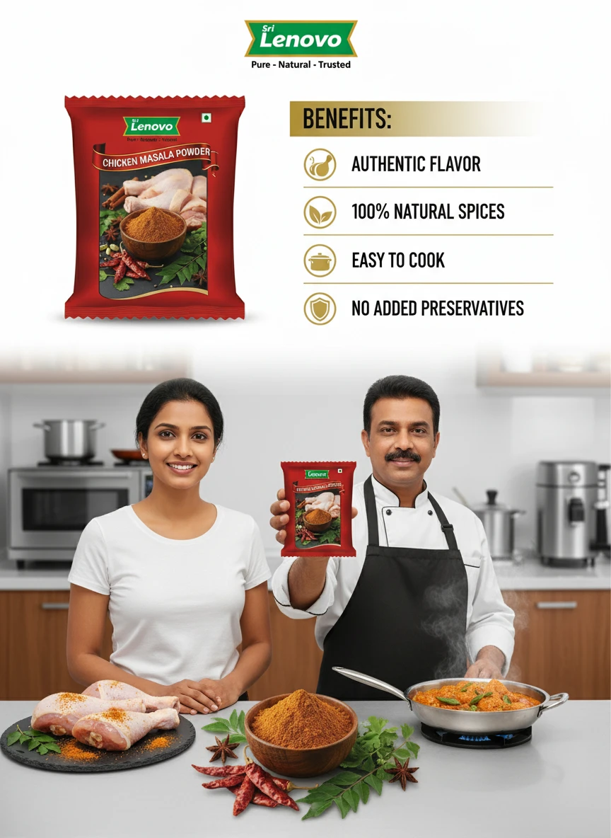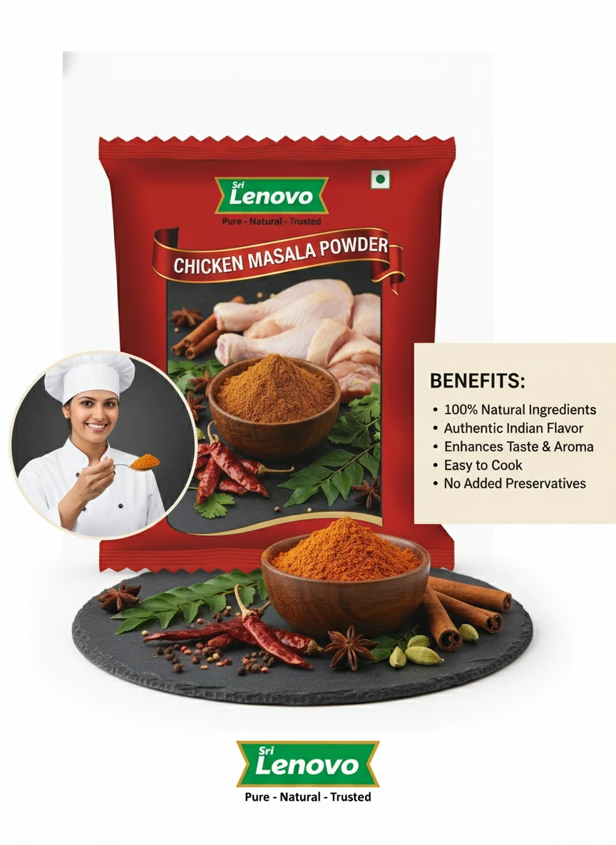 100% Pure Chicken Masala Powder Source Nutritional Value & Wellness Support: Sri Lenovo Chicken Masala Powder is naturally rich in essential nutrients and traditionally valued for supporting overall wellness. It contains naturally occurring compounds that support digestion, nourishment, and daily energy. Free from harmful chemicals, artificial colours, and preservatives, it is safe for regular consumption.