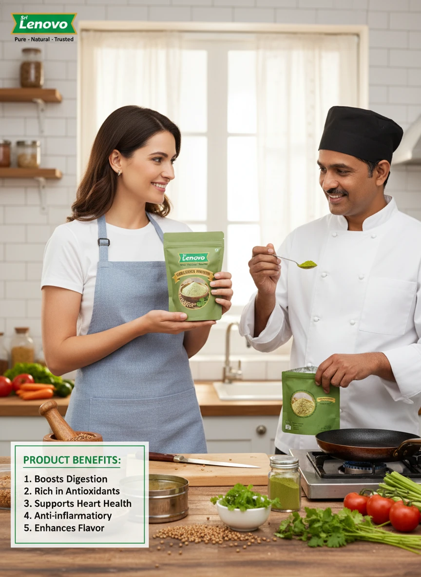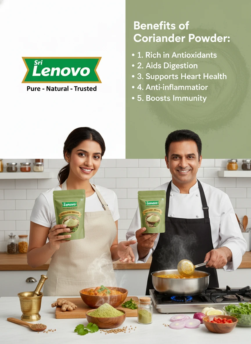 100% Pure Coriander Powder Source Nutritional Value & Wellness Support: Sri Lenovo Coriander Powder is naturally rich in essential nutrients and traditionally valued for supporting overall wellness. It contains naturally occurring compounds that support digestion, nourishment, and daily energy. Free from harmful chemicals, artificial colours, and preservatives, it is safe for regular consumption.