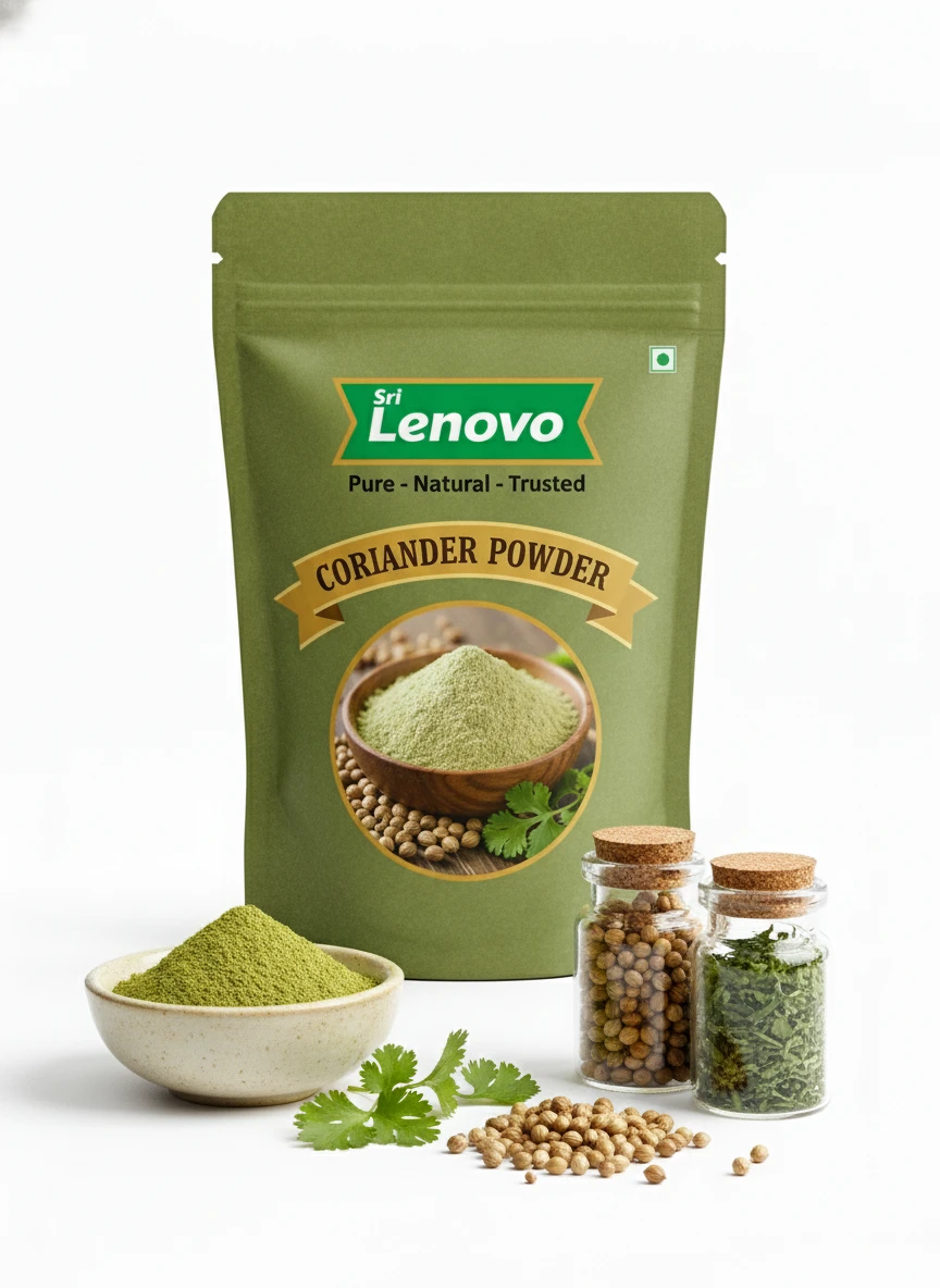 Sri Lenovo Coriander Powder is prepared using carefully selected raw materials that are cleaned, processed, and finely powdered to preserve natural colour, aroma, and taste. This product is hygienically manufactured and packed to retain freshness and quality for everyday use. It blends easily into cooking and daily routines, offering consistency and purity in every serving.