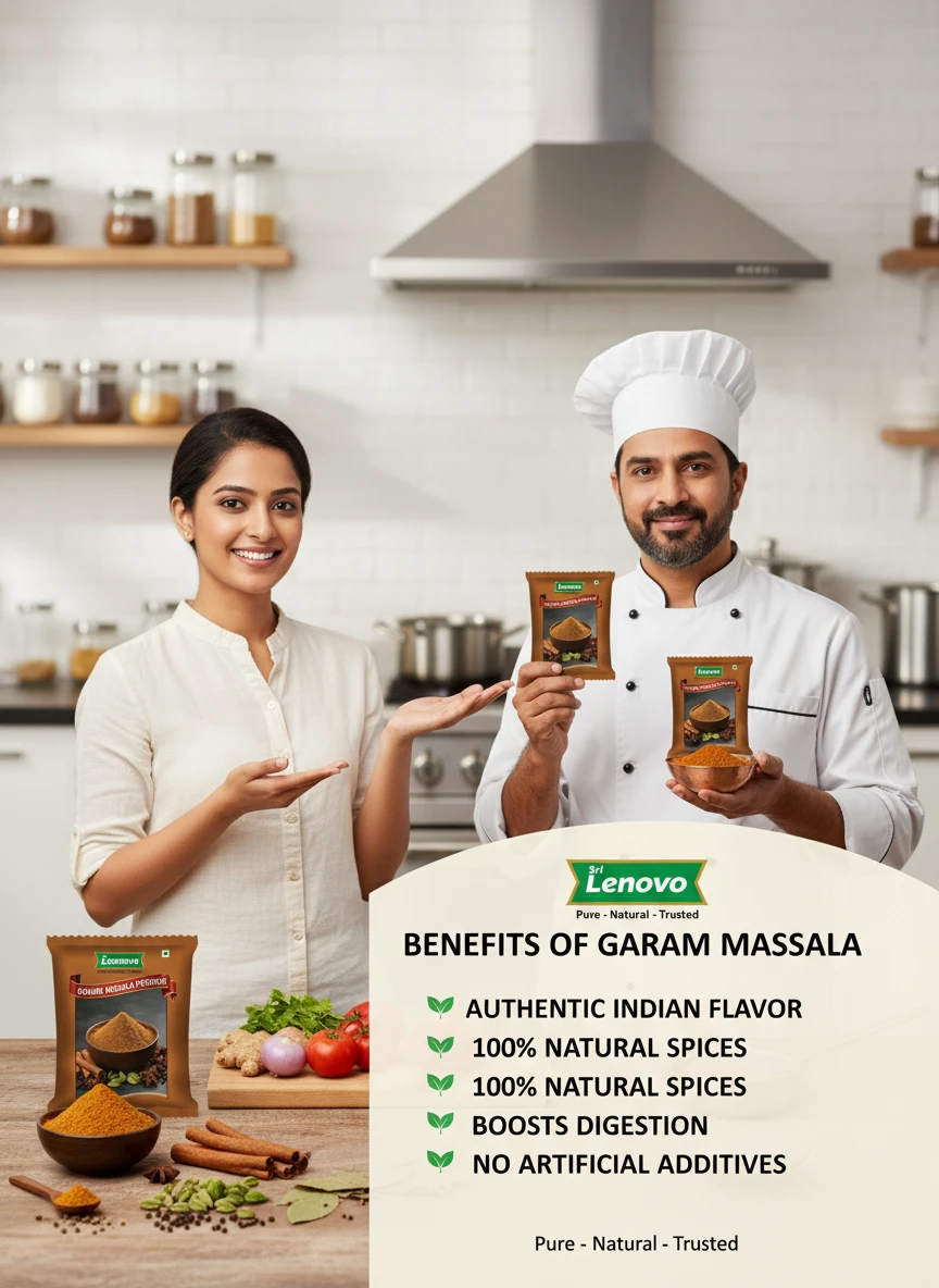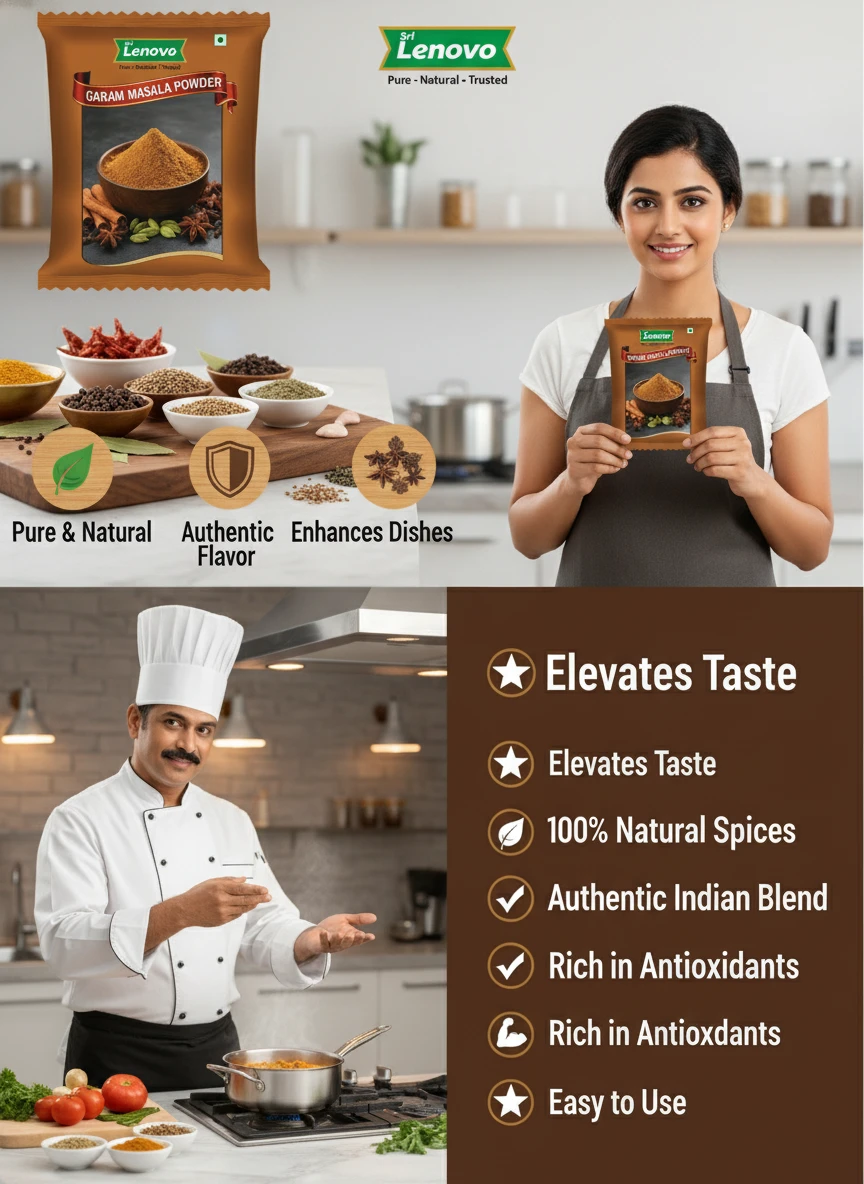 100% Pure Garam Masala Powder Source Nutritional Value & Wellness Support: Sri Lenovo Garam Masala Powder is naturally rich in essential nutrients and traditionally valued for supporting overall wellness. It contains naturally occurring compounds that support digestion, nourishment, and daily energy. Free from harmful chemicals, artificial colours, and preservatives, it is safe for regular consumption.