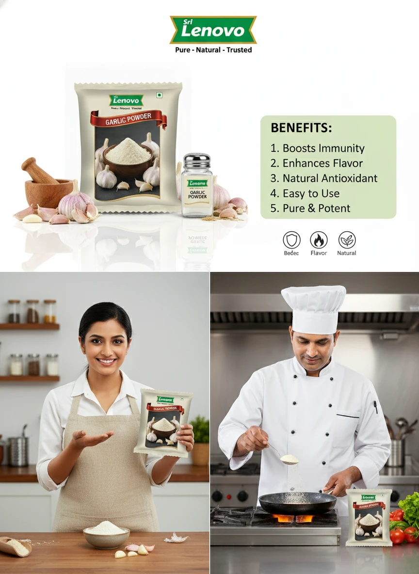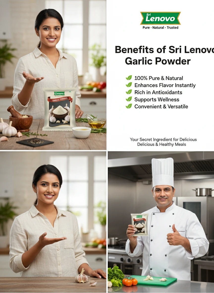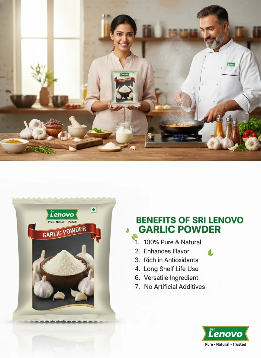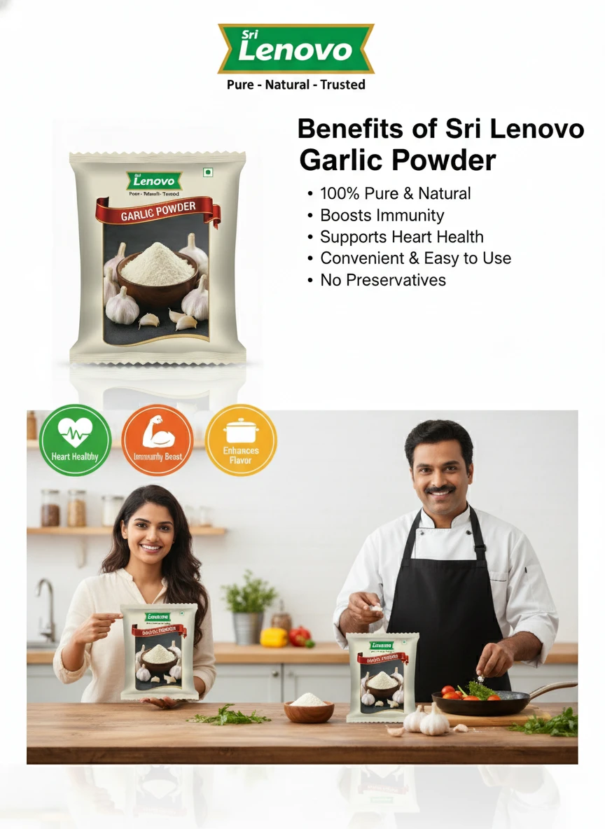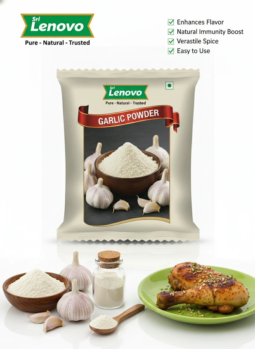 Sri Lenovo Garlic Powder stands out for its natural appearance, clean aroma, and fine texture. Carefully processed to maintain original characteristics, it delivers dependable quality and authentic taste suitable for modern kitchens and traditional practices. How to Use: Sri Lenovo Garlic Powder can be used in daily cooking, beverages, health recipes, and traditional preparations. It mixes easily and enhances flavour, nutrition, or functionality depending on use. Why Choose Sri Lenovo: At Sri Lenovo, we focus on purity, hygiene, and trust. Our products are made with care using quality ingredients and clean processing standards, ensuring safety, consistency, and satisfaction in every pack.