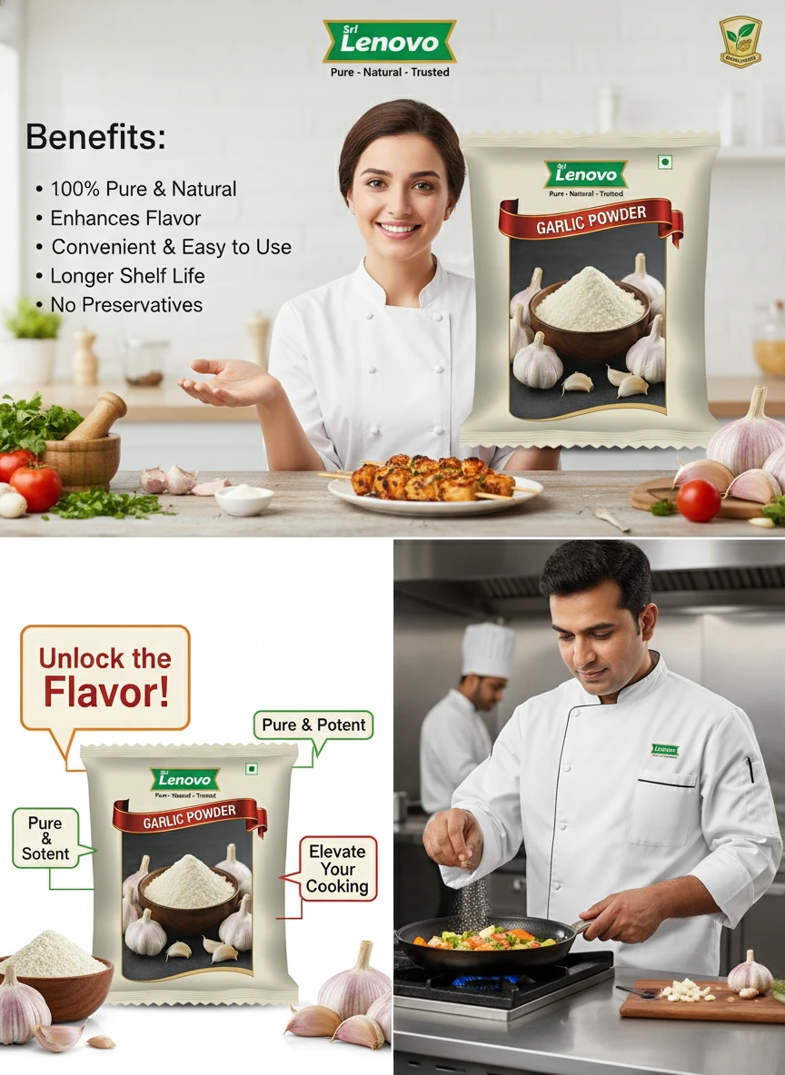 100% Pure Garlic Powder Source Nutritional Value & Wellness Support: Sri Lenovo Garlic Powder is naturally rich in essential nutrients and traditionally valued for supporting overall wellness. It contains naturally occurring compounds that support digestion, nourishment, and daily energy. Free from harmful chemicals, artificial colours, and preservatives, it is safe for regular consumption.