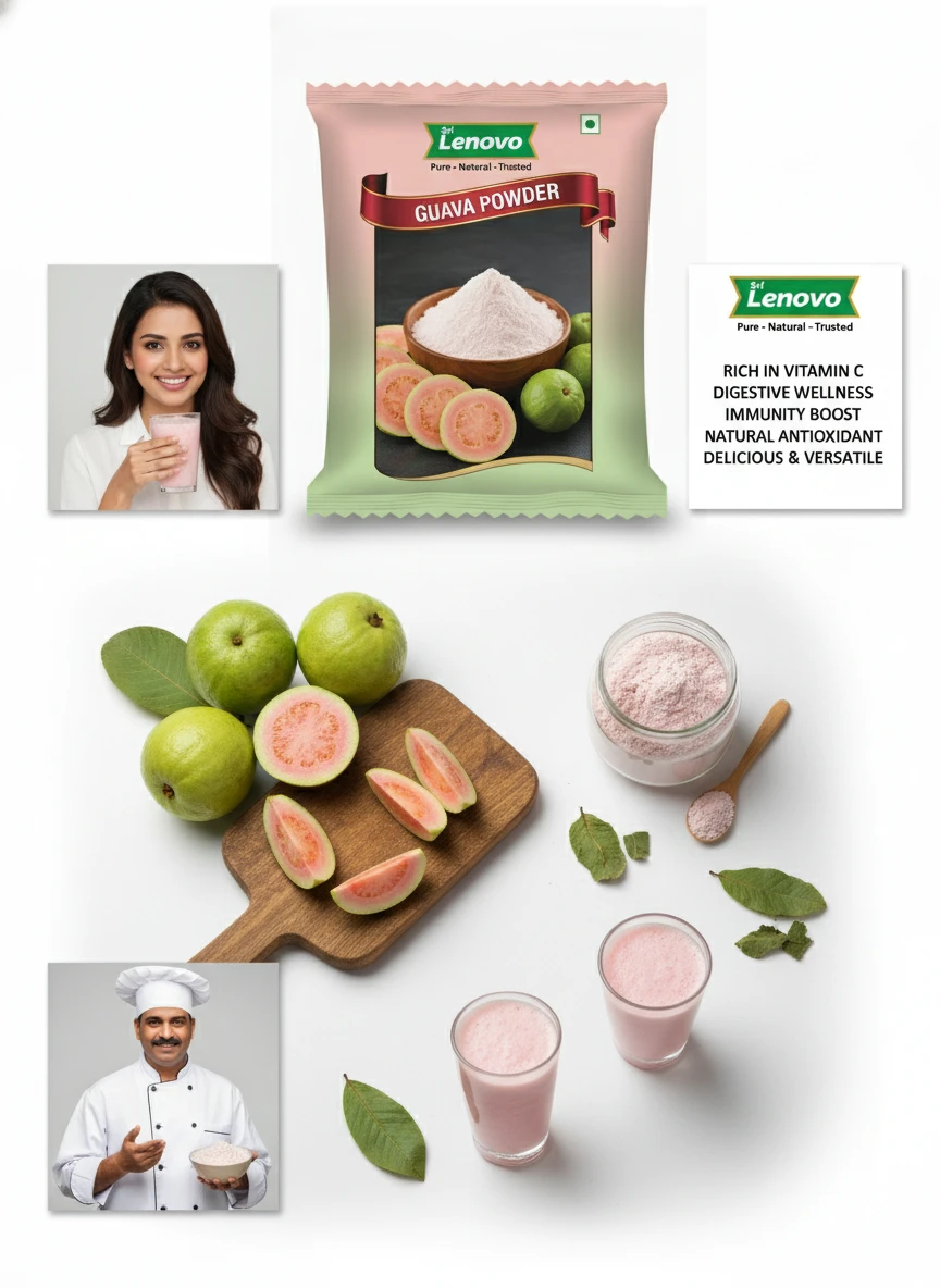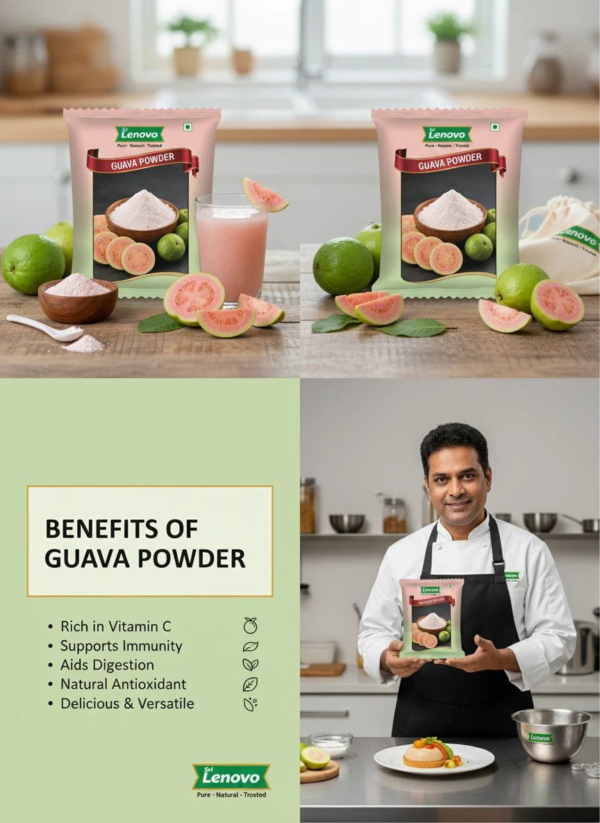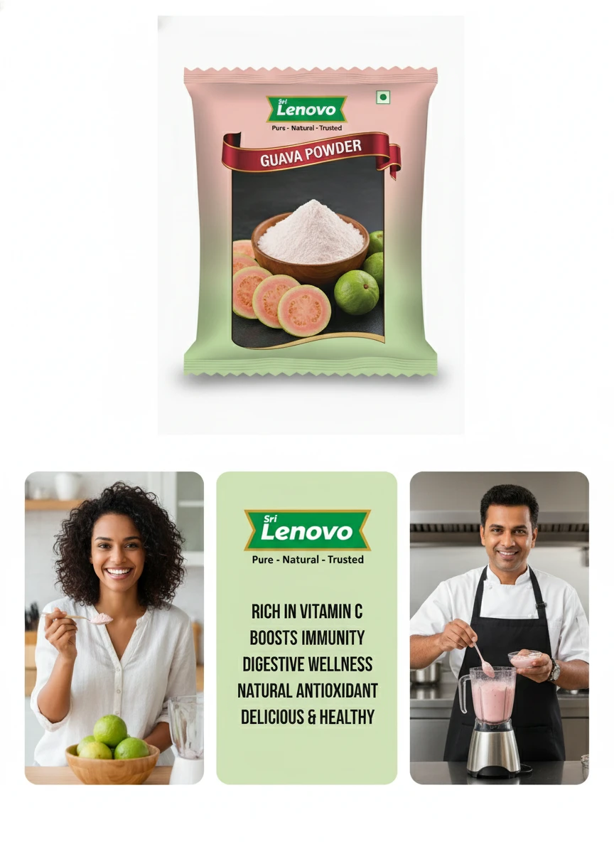 100% Pure Guava Powder Source Nutritional Value & Wellness Support: Sri Lenovo Guava Powder is naturally rich in essential nutrients and traditionally valued for supporting overall wellness. It contains naturally occurring compounds that support digestion, nourishment, and daily energy. Free from harmful chemicals, artificial colours, and preservatives, it is safe for regular consumption.