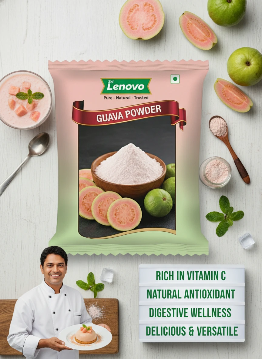 Sri Lenovo Guava Powder is prepared using carefully selected raw materials that are cleaned, processed, and finely powdered to preserve natural colour, aroma, and taste. This product is hygienically manufactured and packed to retain freshness and quality for everyday use. It blends easily into cooking and daily routines, offering consistency and purity in every serving.