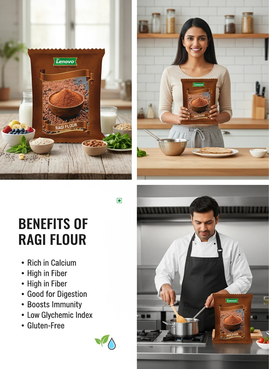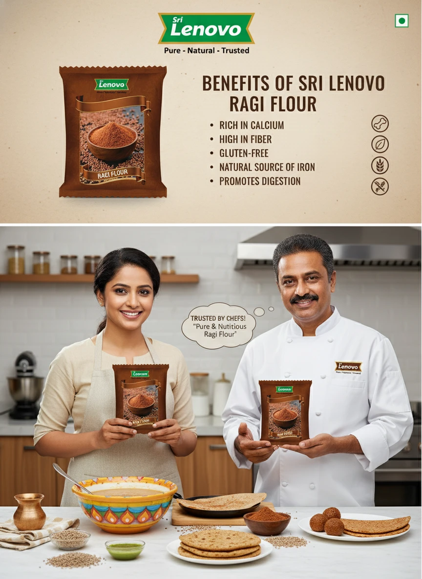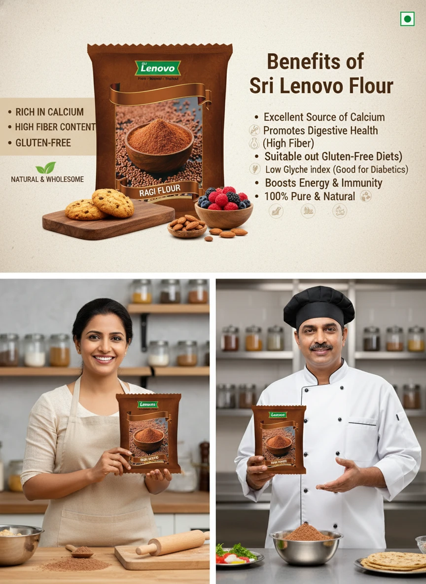 100% Pure Ragi Powder Source Nutritional Value & Wellness Support: Sri Lenovo Ragi Powder is naturally rich in essential nutrients and traditionally valued for supporting overall wellness. It contains naturally occurring compounds that support digestion, nourishment, and daily energy. Free from harmful chemicals, artificial colours, and preservatives, it is safe for regular consumption.