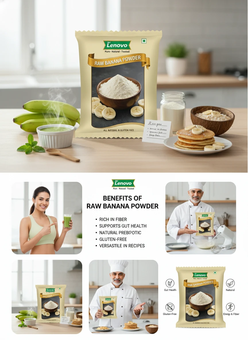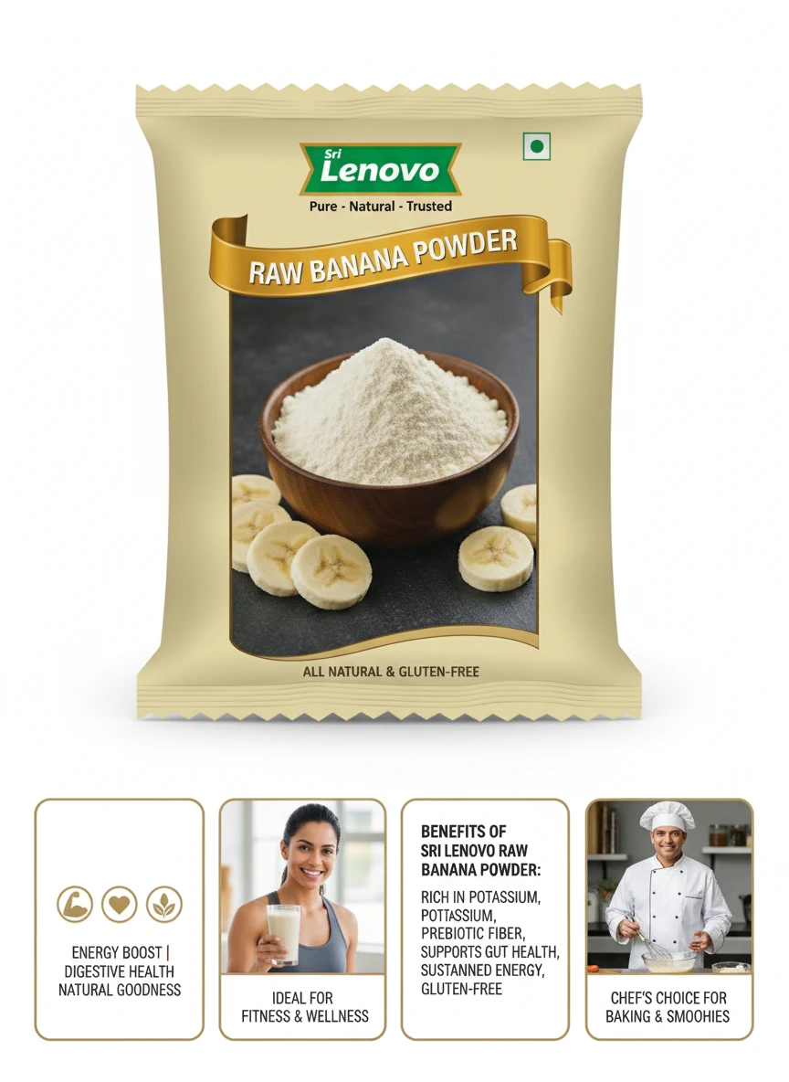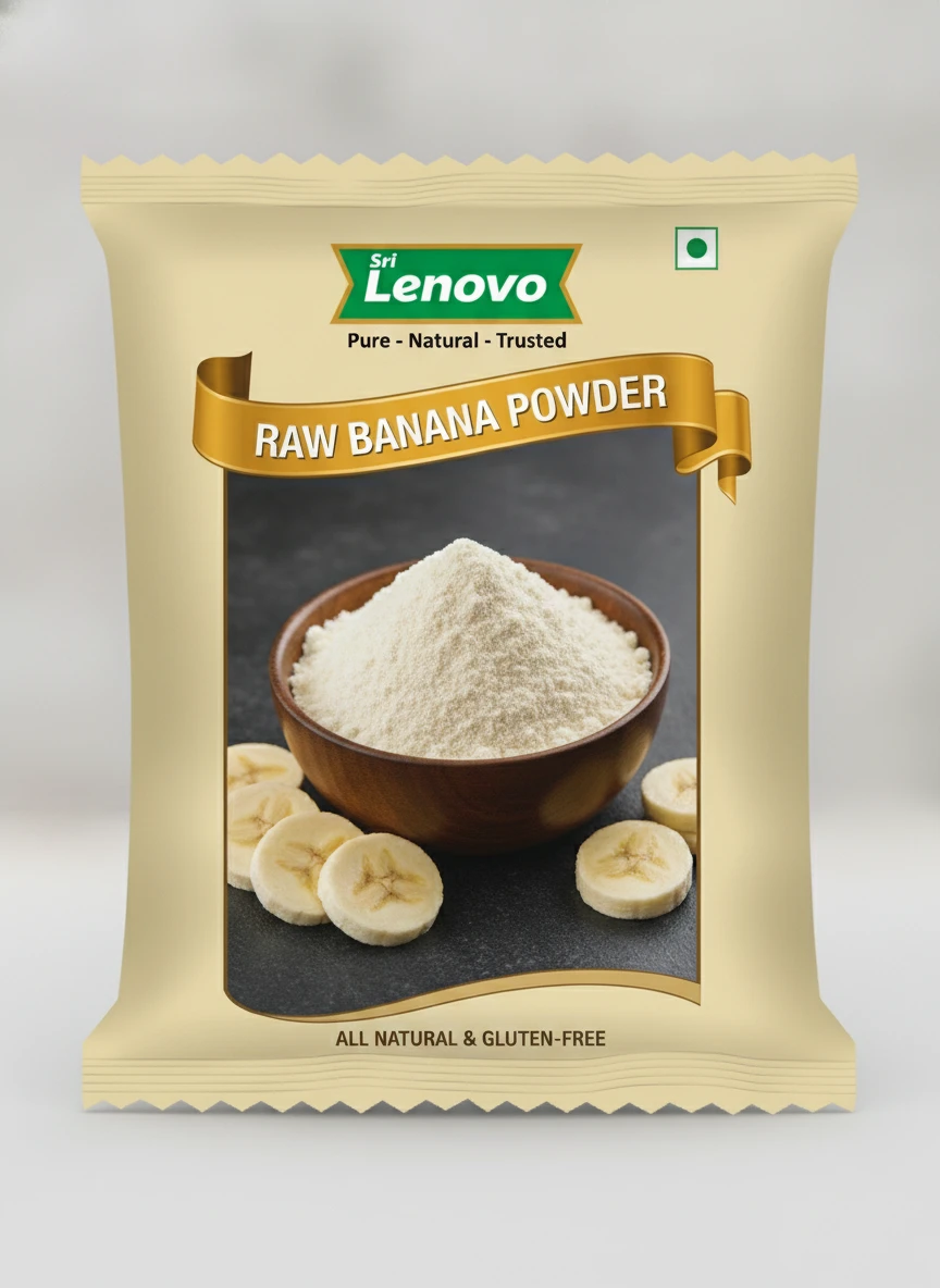 Sri Lenovo Raw Banana Powder is made from carefully selected raw bananas that are cleaned, sliced, dried, and finely powdered to preserve their natural goodness. Hygienically processed and packed, this powder retains its mild flavour and smooth texture, making it suitable for everyday use in a variety of preparations.