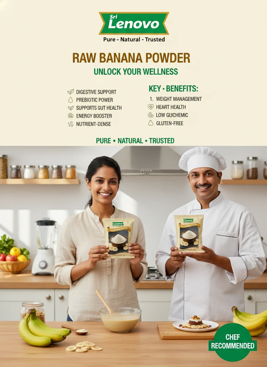 Sri Lenovo Raw Banana Powder can be mixed into porridge, beverages, soups, and traditional recipes. It is also suitable for baby food preparations, health recipes, and everyday cooking needs.