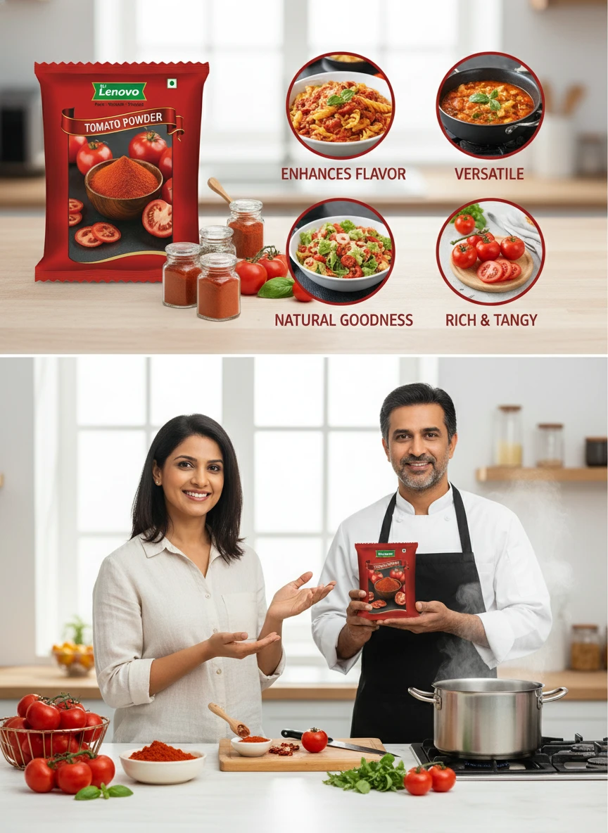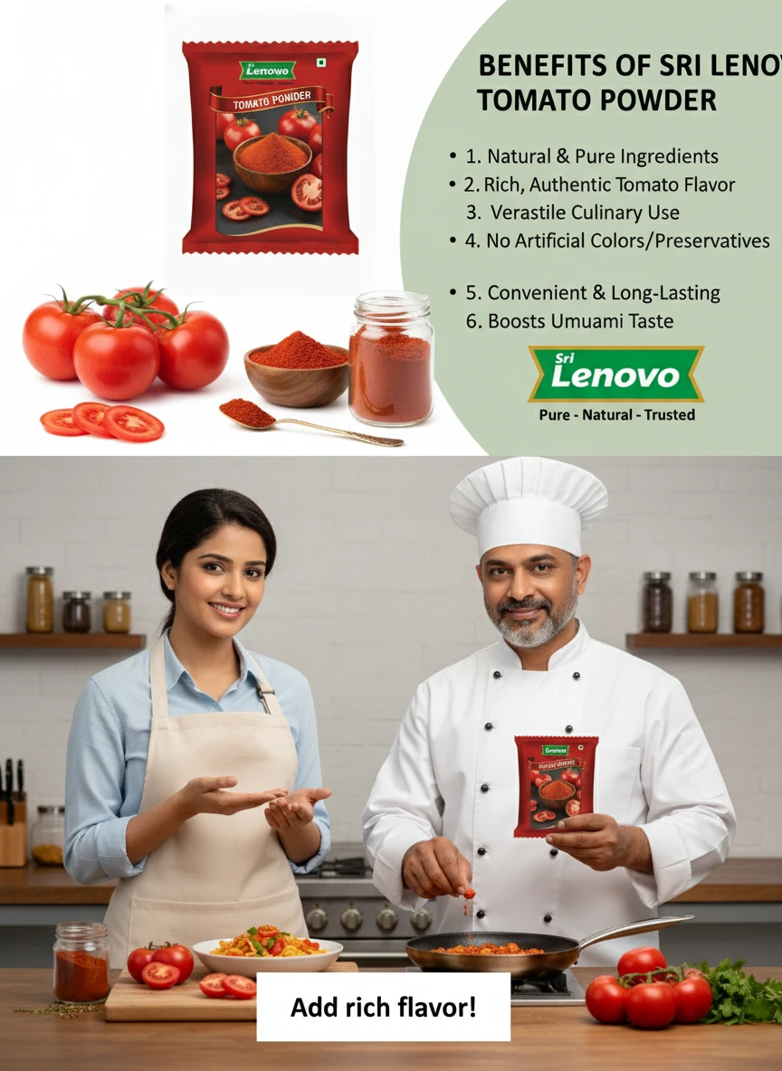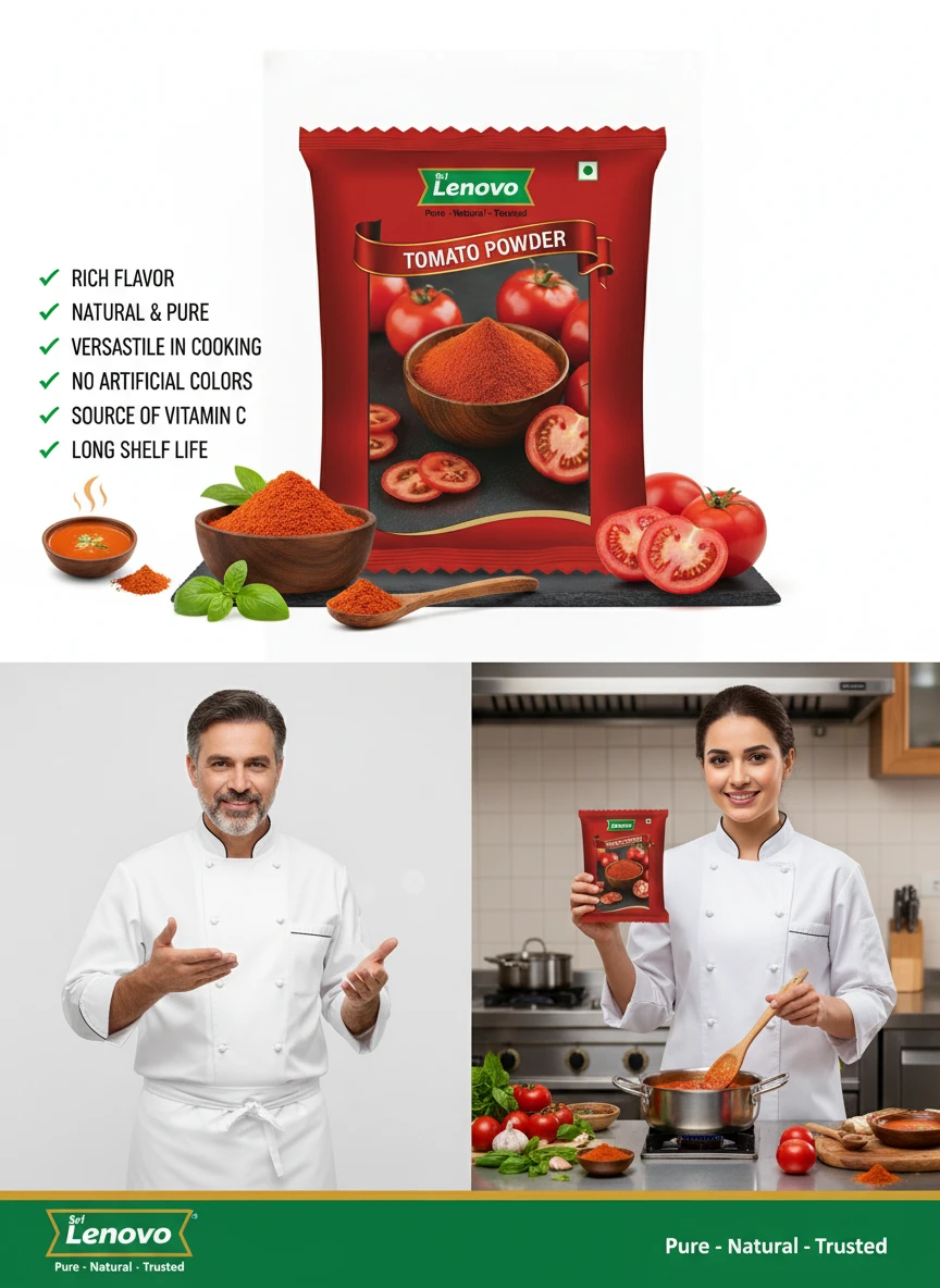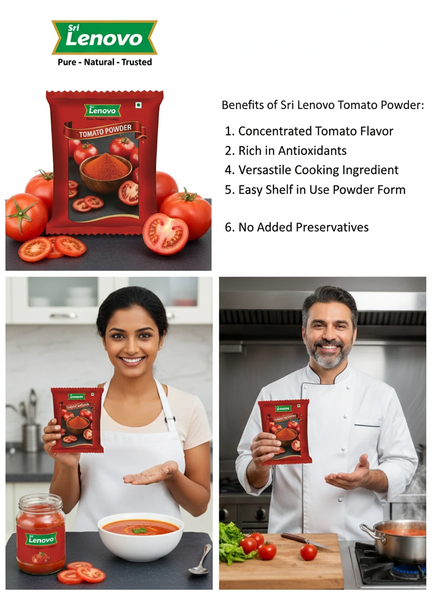 100% Pure Tomato Powder Source Nutritional Value & Wellness Support: Sri Lenovo Tomato Powder is naturally rich in essential nutrients and traditionally valued for supporting overall wellness. It contains naturally occurring compounds that support digestion, nourishment, and daily energy. Free from harmful chemicals, artificial colours, and preservatives, it is safe for regular consumption.
