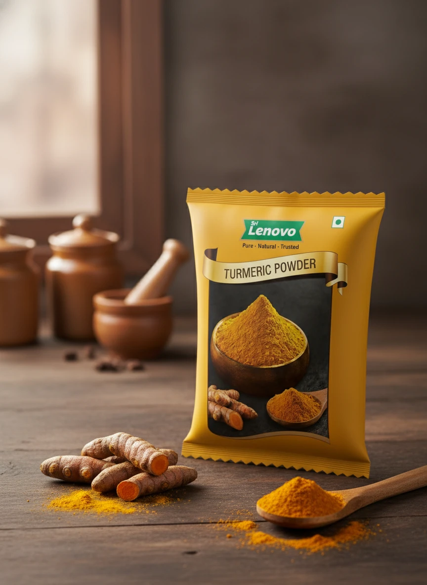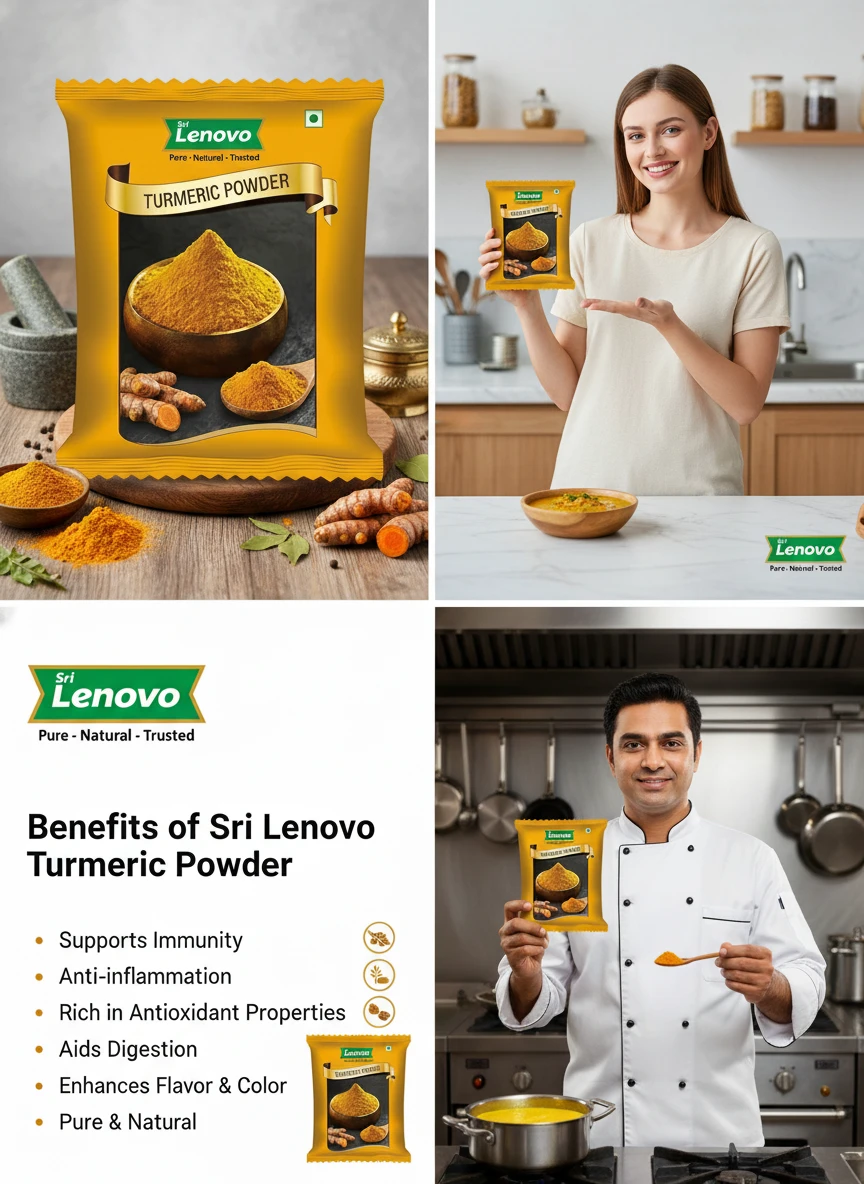 Sri Lenovo Turmeric Powder stands out for its bright golden-yellow colour and strong natural aroma. The turmeric roots are carefully selected and finely ground to ensure consistent quality and flavour.